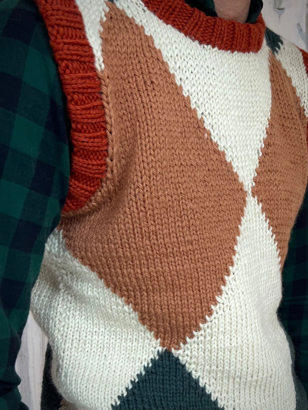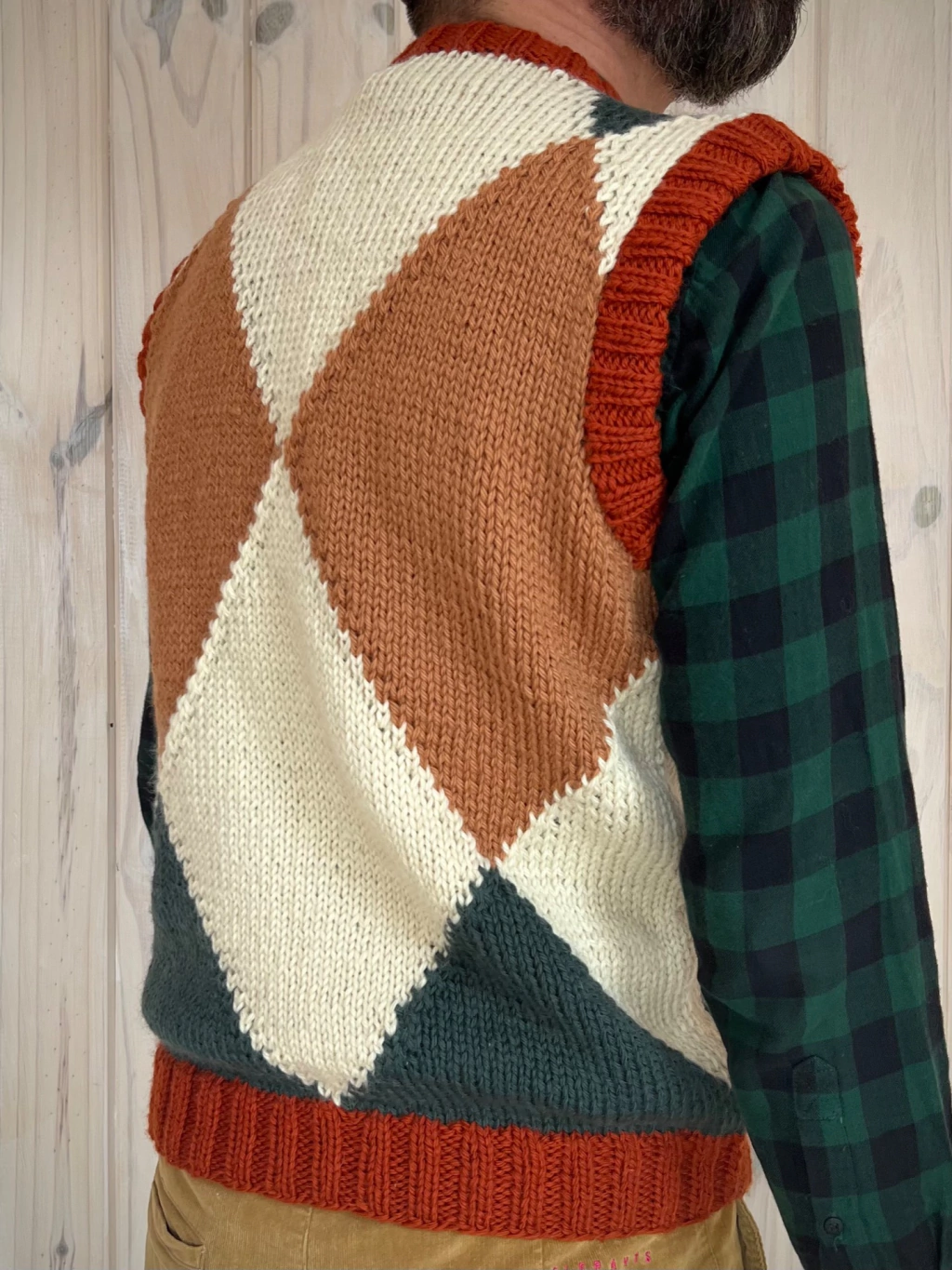 Chaleco cuello redondo, tejido artesanalmente a 2 agujas en punto jersey. Las costuras y terminaciones tambien son todas realizadas a mano.