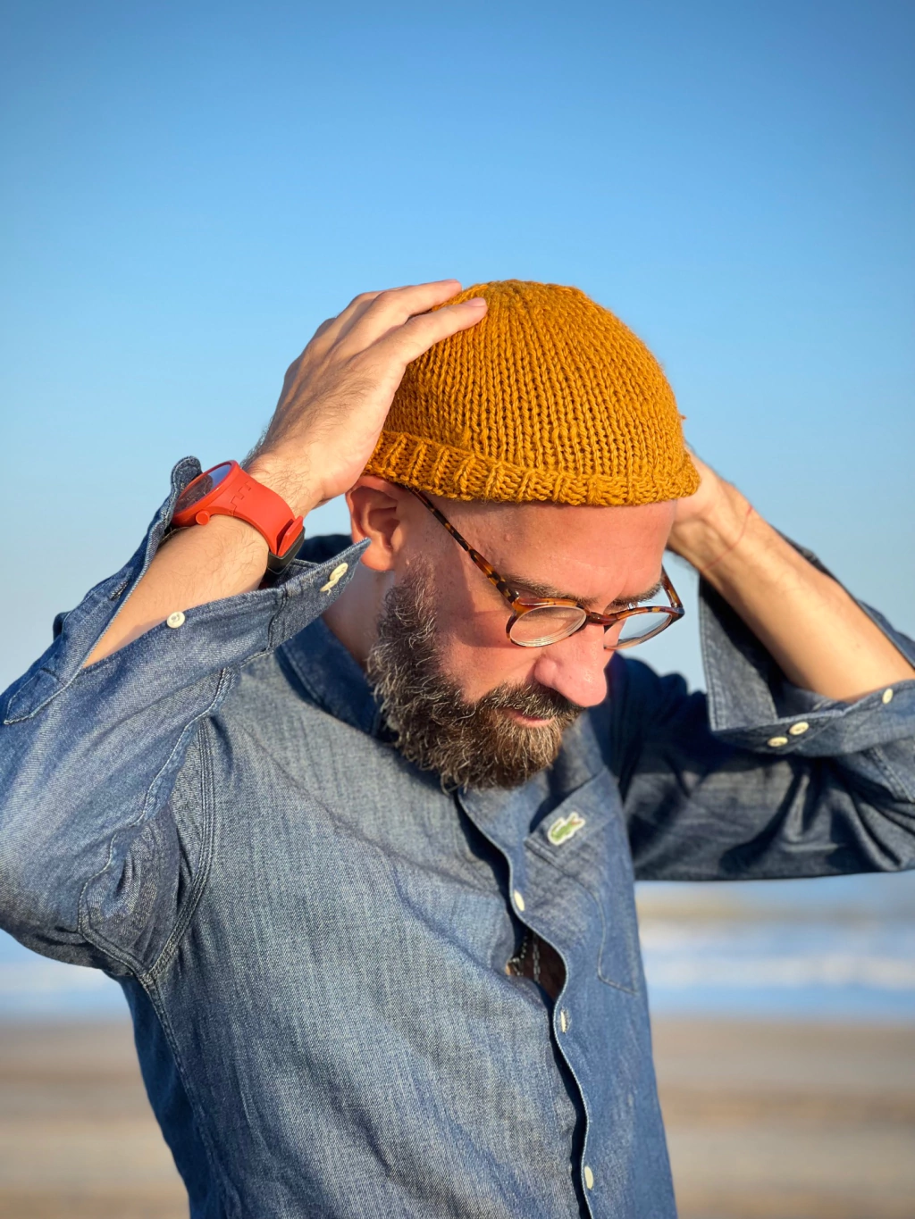 Beanie cortito tejido artesanalmente a 2 agujas en punto jersey. Lleva como identificación de marca una estampa de cuero cosida en el lateral. Tamaño unico, largo total del gorrito desplegado sin doblar: 16 cm